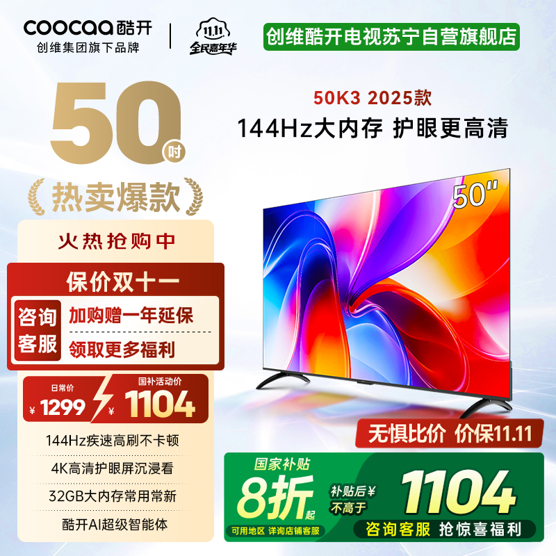 创维酷开电视 50K3 2+32GB 二级能效 AI远场语音液晶电视机平板电视机50P3F