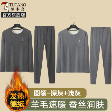 啄木鸟含羊毛蚕丝保暖内衣男套装加绒德加厚发热防寒秋衣裤2024冬 圆领两套装深灰+浅灰羊毛速暖蚕丝润肤 2XL推荐体重130-150斤