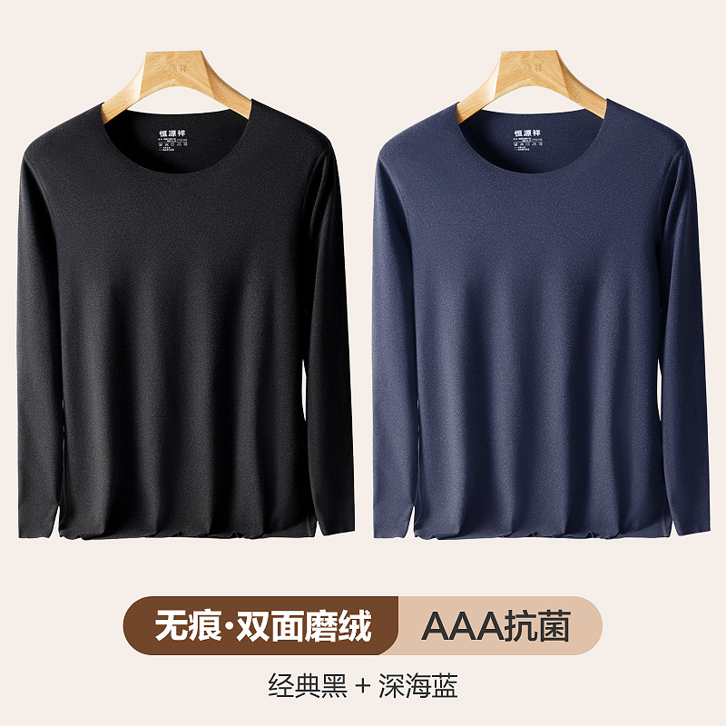 恒源祥保暖内衣男士秋衣单件上衣薄款无痕内穿紧身打底衫冬季 165/M 无痕【双面磨绒】经典黑+深海蓝