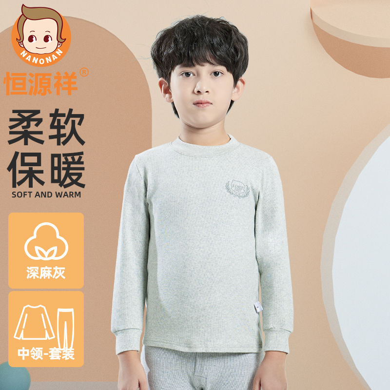 恒源祥儿童内衣套装棉质男童女童秋衣秋裤套装中大童保暖内衣_895 身高110-120体重46-56斤 男童-深麻灰-【中领】