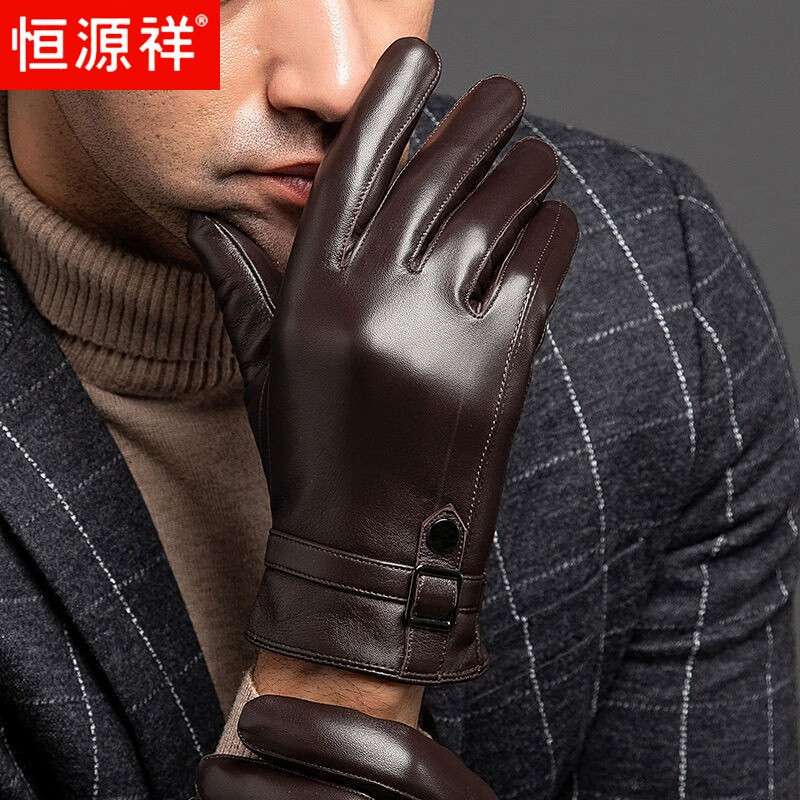 恒源祥真皮手套男冬天骑行冬季加绒触屏保暖加厚羊皮手套男士开车 男士真皮手套--皮带箭头向下款棕L