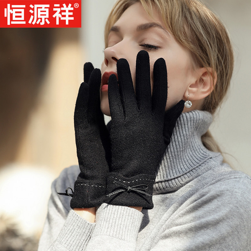 恒源祥羊毛手套女冬天加绒加厚保暖韩版开车触屏手套绒五指薄款 黑色加绒-B款-均码