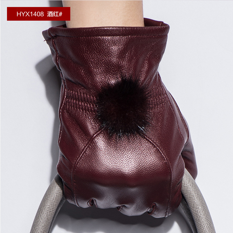 恒源祥真皮手套骑车秋冬季手套加厚保暖开车女士羊皮手套 酒红L