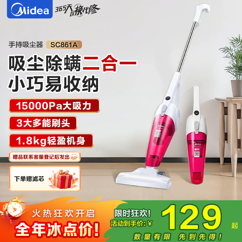 美的(Midea)[国家补贴]SC861A轻音吸尘器家用大吸力大功率强力有线小型手持除尘机吸尘机两用宠物猫毛狗 紫色