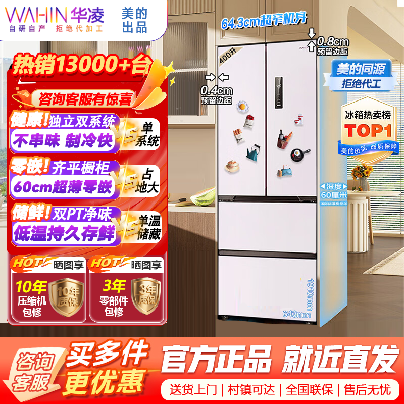 [官方正品]华凌冰箱 美的出品 60cm超薄零嵌入 法式多门一级能效节能省电全空间净味家用风冷冰箱HR-419WUFPZ