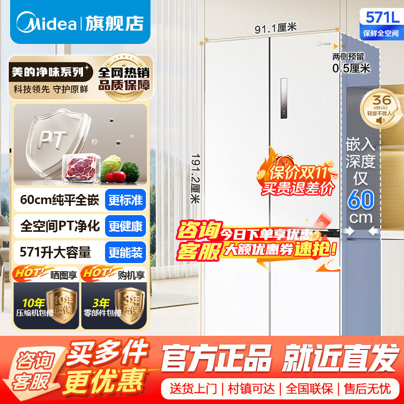 [官方正品]美的571纯平全嵌十字对开四开门一级能效风冷无霜底部散热大容量电冰箱BCD-571WUSPZM(E)流苏白