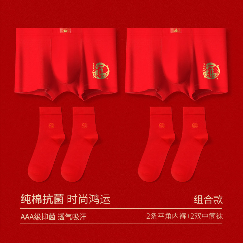 恒源祥本命年内裤男士平角纯棉大红色属虎年结婚四角短裤棉_798 175/XL C款【2内裤2袜子】万事如意