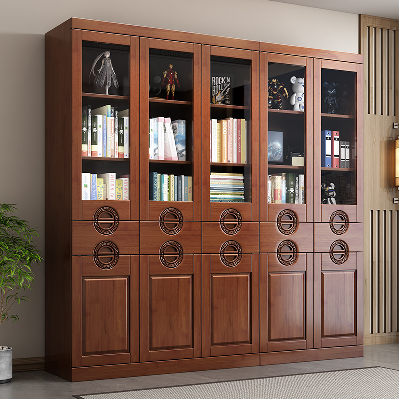 青木川 中式实木书柜书架落地靠墙带玻璃门客厅书房卧室收纳储物柜多层置物文件资料柜立柜两门三门五门组合办公室书橱 胡桃色 五门【200x32x200cm】