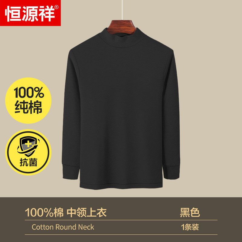 恒源祥男士秋衣纯棉春秋季打底棉毛衫中老年人中领长袖保暖上衣男 4XL推荐180-200斤 纯棉保暖中领款/黑色