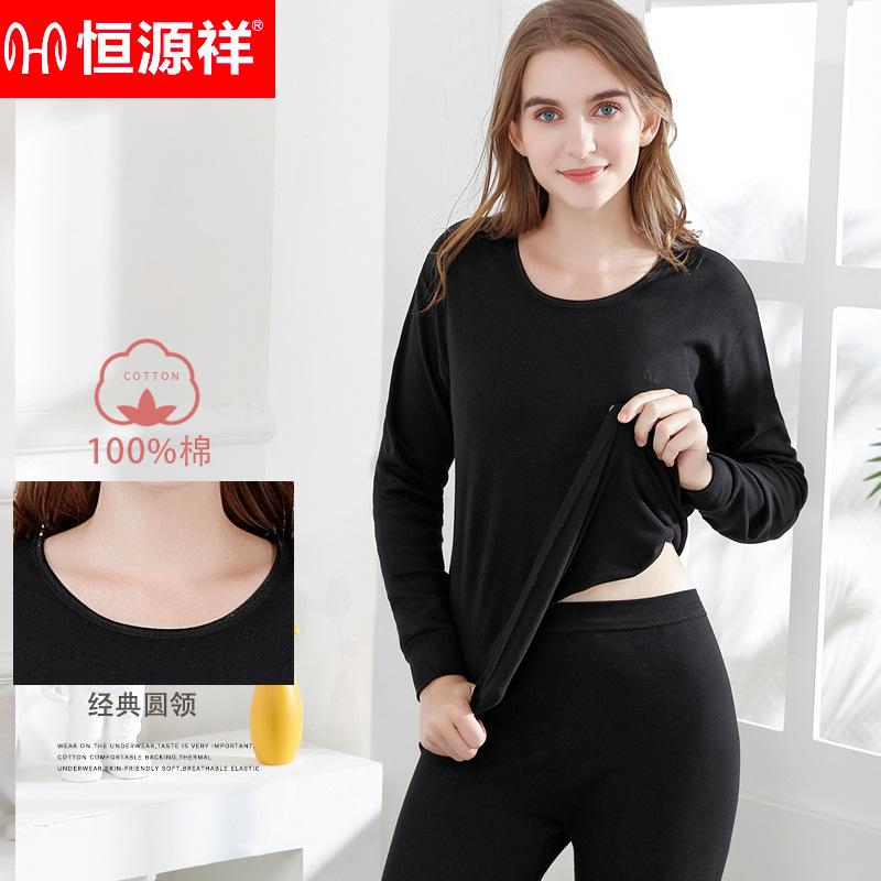 恒源祥秋衣秋裤纯棉套装女士保暖内衣棉毛衫薄款打底冬季_19 160/85 黑色圆领