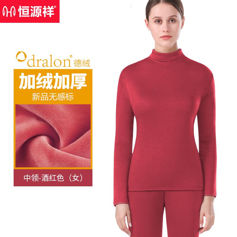 恒源祥保暖内衣德绒发热秋衣秋裤女士套装加绒加厚内穿打底棉毛衫_246_568 175/XL【德绒加厚发热保暖】 【中领】酒红
