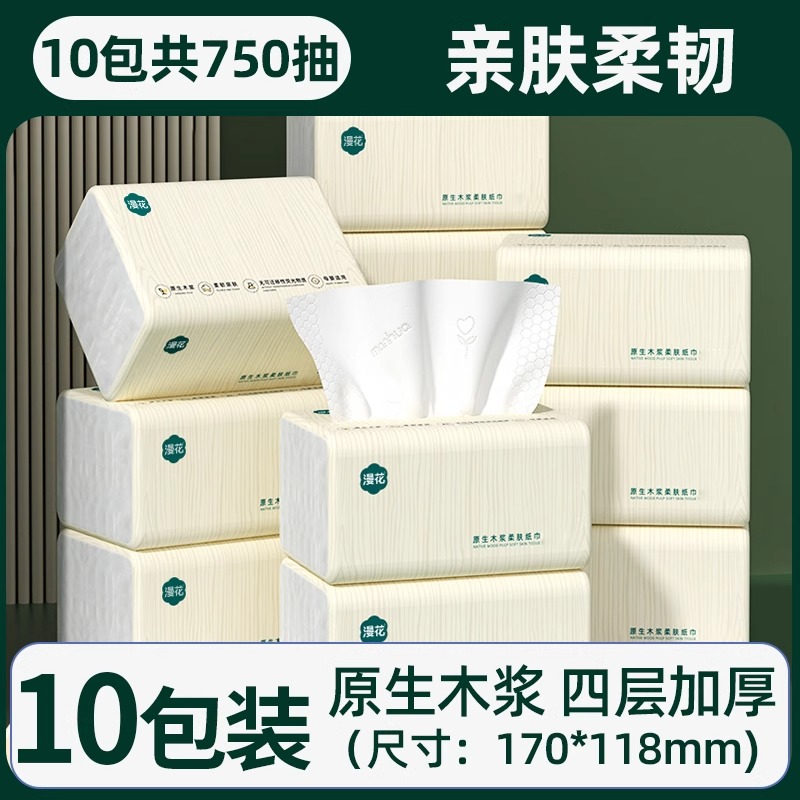 漫花40包抽纸加厚卫生纸无香型擦手纸家用整箱囤货装擦手面巾纸抽 4层300张*10包超值优选木浆