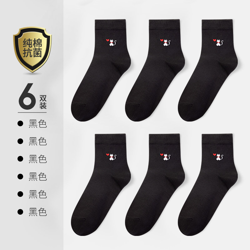恒源祥袜子女中筒纯棉春夏季薄款日系纯色女袜秋潮袜四季棉_661 100%纯棉中筒女袜(35-39码) 可爱狐狸-6黑色