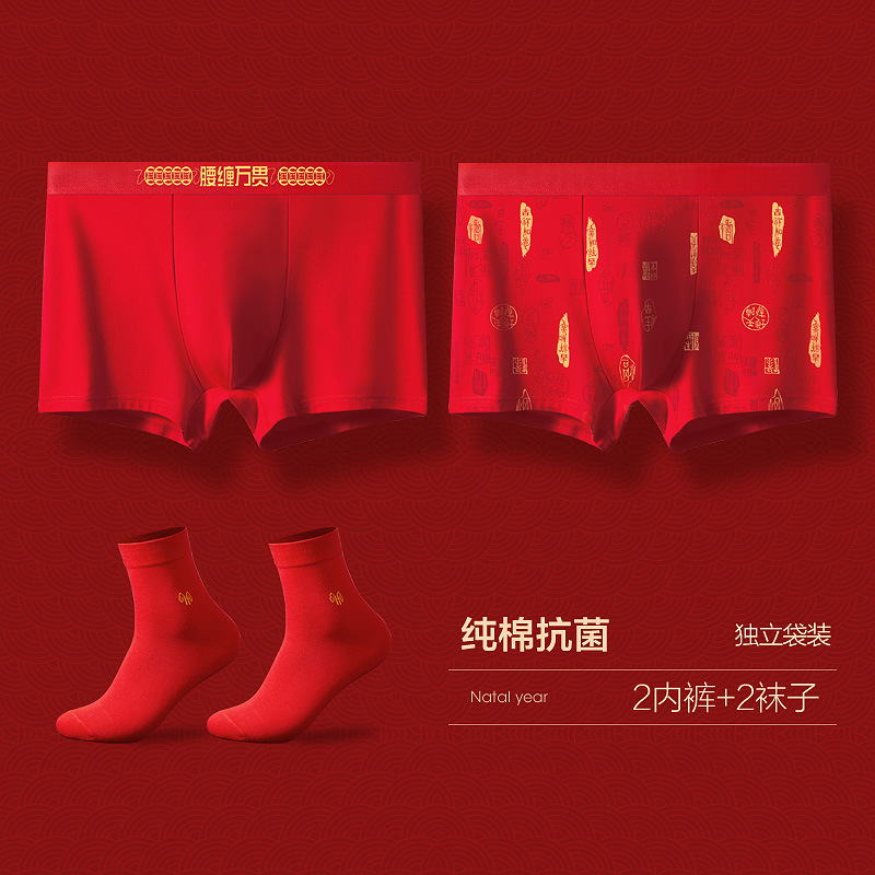 恒源祥本命年内裤男士平角裤纯棉大红色属虎年结婚四角短裤头_22 180/2XL 【2内裤2袜子】虎年鸿运