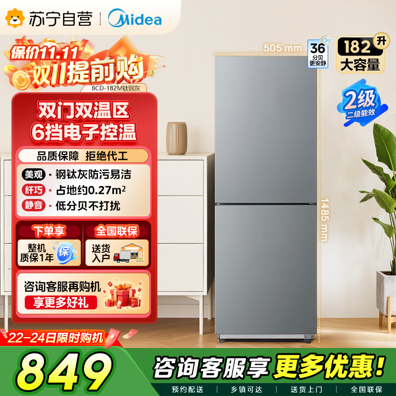 美的(Midea) 冰箱182升双开门两门小户型家用客厅租房宿舍冰箱可冷藏冷冻小巧不占地低音运行BCD-182M