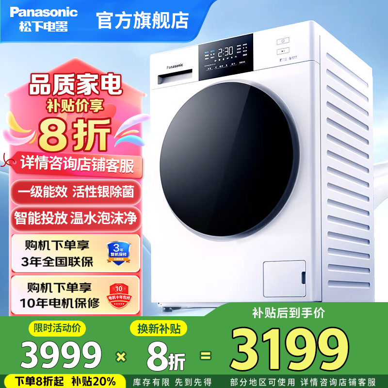 松下全自动滚筒洗衣机10公斤大容量家用变频电机羊毛洗活性银除菌纯平全嵌 智能投放空气洗 小白盒XQG100-81K4