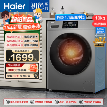 海尔(Haier)初色系列 10公斤 变频 滚筒洗衣机 洗烘一体机 六维减震 超薄 106C升级款 H606H 消费补贴