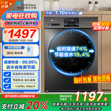 [苏宁自营]小天鹅滚筒洗衣机全自动变频10公斤大容量家用羽绒服洗除菌除螨 [洗净比1.1新款]