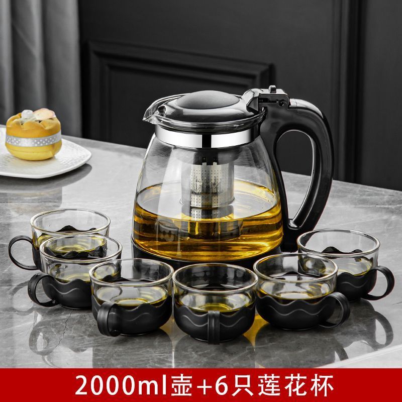 水壶耐高温防爆玻璃泡茶壶家用泡茶大号加厚过滤花茶壶茶具套装 2000毫升+6莲花杯