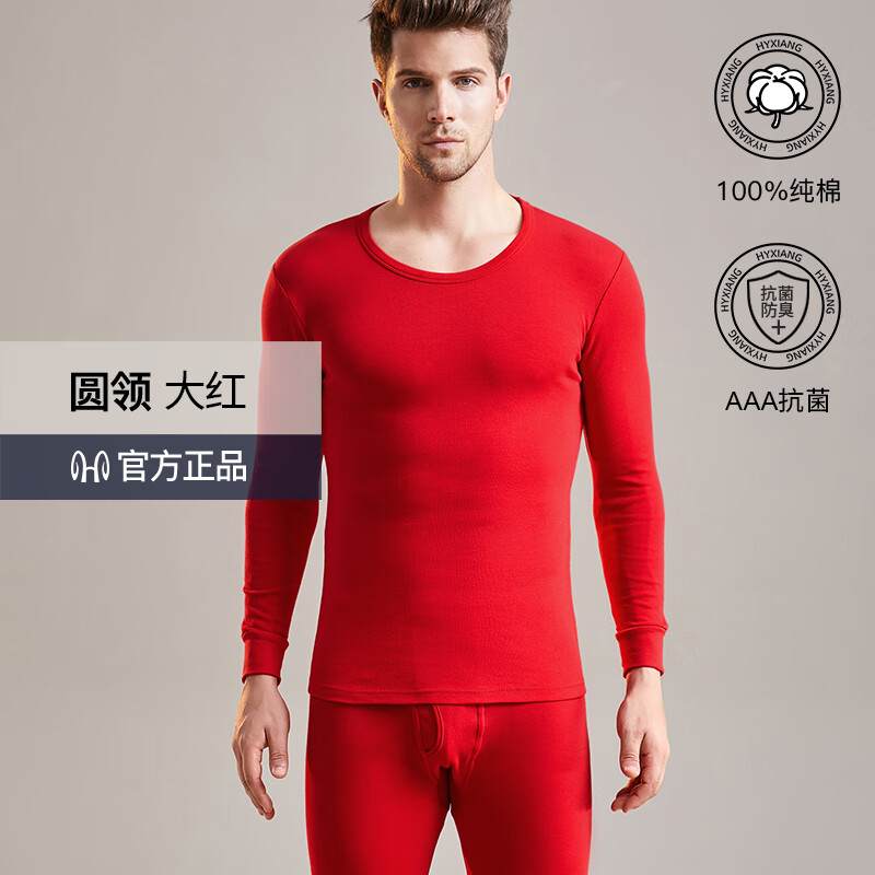 恒源祥男士本命年大红色全棉保暖内衣女中领兔年秋衣秋裤纯棉套装_113 165(M) 【圆领-男】纯棉套装