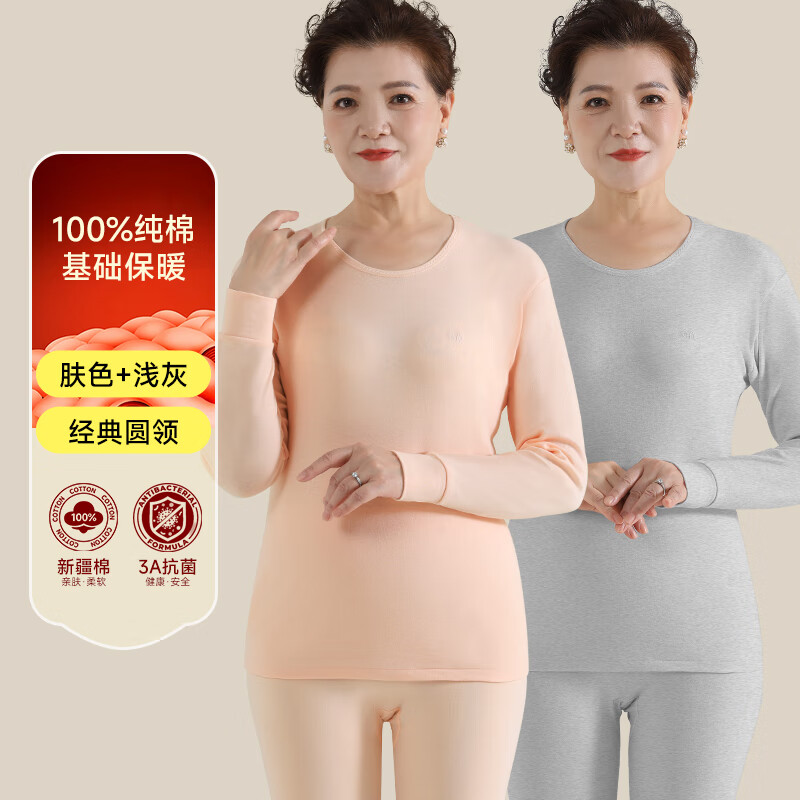 恒源祥老年人秋衣秋裤套装女秋冬季纯棉妈妈保暖内衣线衣线裤_210_412 175/XL 【2套】-圆领肤色+浅灰