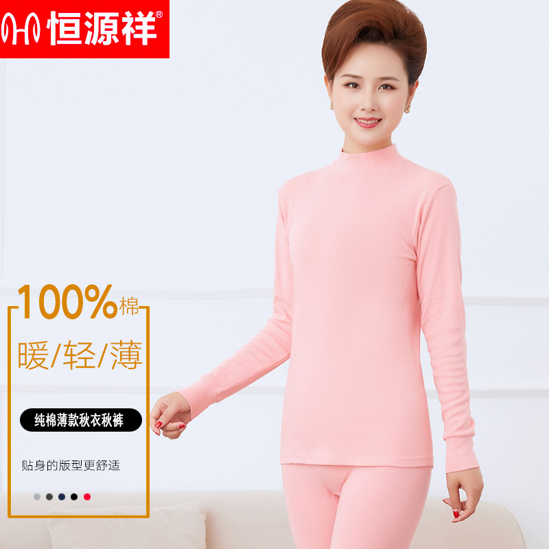 恒源祥女士秋衣秋裤纯棉半高领棉毛衫青年棉保暖内衣薄款套装秋