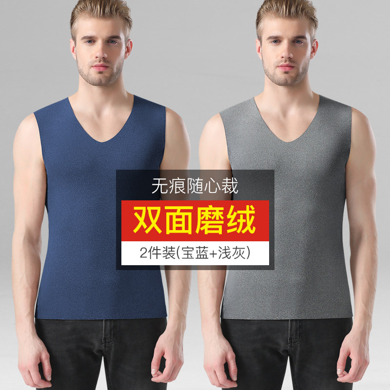 恒源祥男士保暖背心无痕加厚加绒德发热打底内衣男款内穿冬季上衣_109 175/XL 【双面磨绒】浅灰+宝蓝