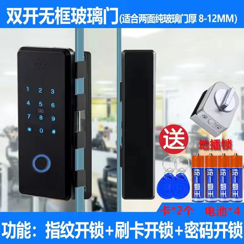 郢视 办公室玻璃门指纹锁免开孔密码锁刷卡锁遥控单双门有无框智能全自动电子门锁 指纹密码刷卡款 黑色 双门无框玻璃门