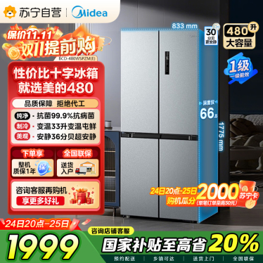 美的(Midea)480升十字对开冰箱一级智能双变频家用电冰箱双循环风冷无霜温湿精控大容量BCD-480WSPZM(E)