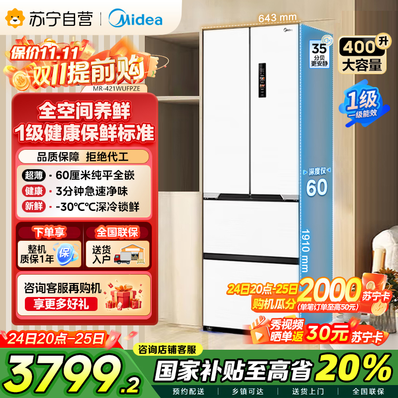 美的(Midea)M60系列超薄可嵌入式一级变频除菌法式多门四开门家用无霜白色大容量智能电冰箱MR-421WUFPZE