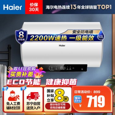 海尔(Haier)60升电热水器EC6001-R3 2.2KW速热洗 一级能效 80℃高温杀菌 灵活安装