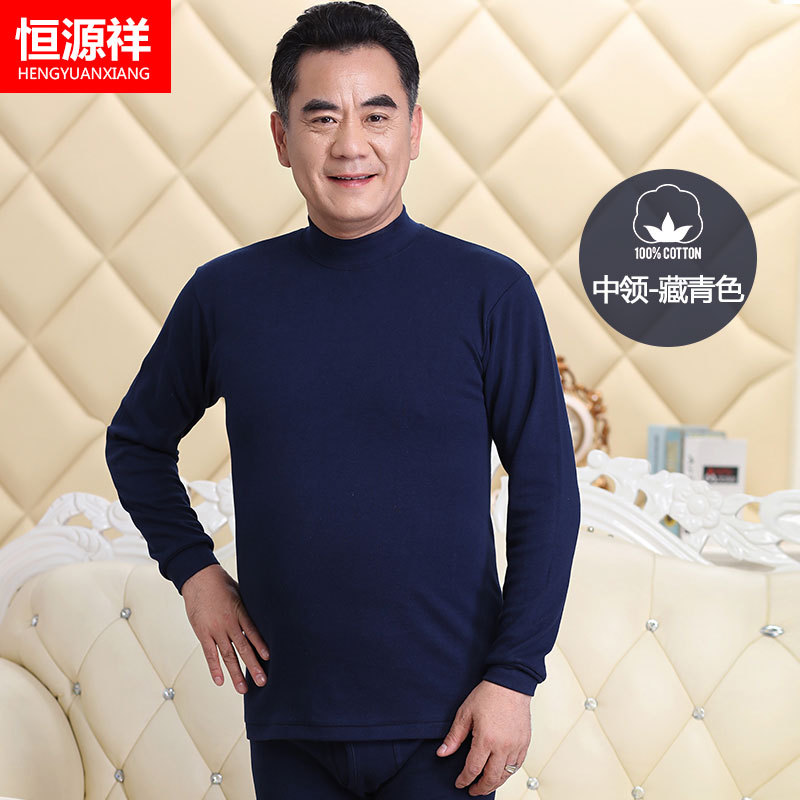 恒源祥棉毛衫秋衣秋裤男款圆领纯棉女士中领纯色V领防寒套装_559_644 M/165 藏青-男中领