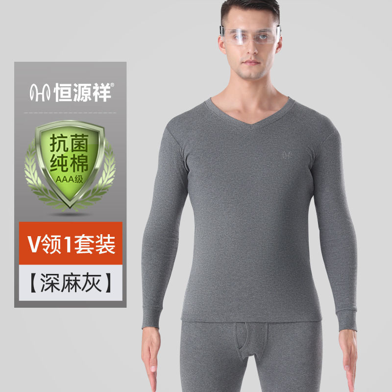 恒源祥男士纯棉毛衫秋衣单件上衣中高领保暖大码内衣套装男秋冬季_192 185/3XL 上衣+裤子【纯棉V领】深灰