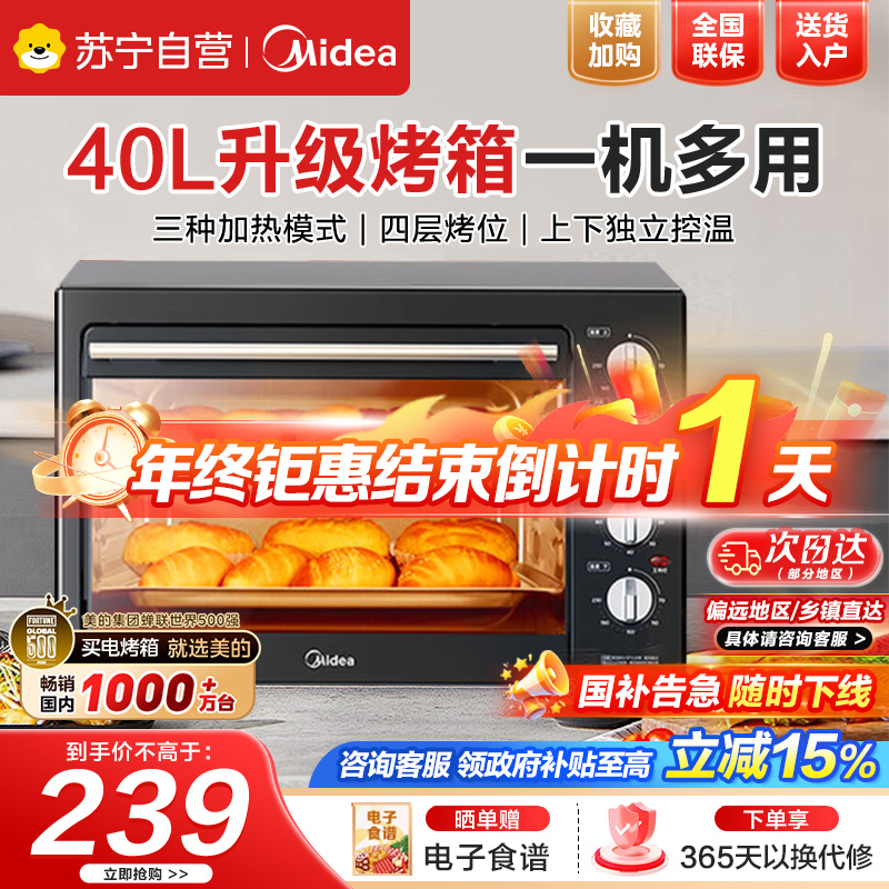 美的电烤箱家用大容量40L MG38CB-AA独立控温/机械操控/四层烤位/多功能烘焙