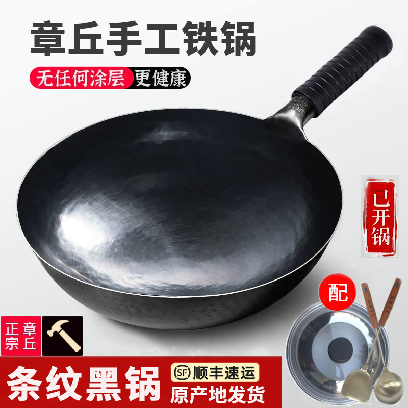 章丘手工黑锅 34cm一体把宗师条纹黑锅+不锈钢盖铲勺