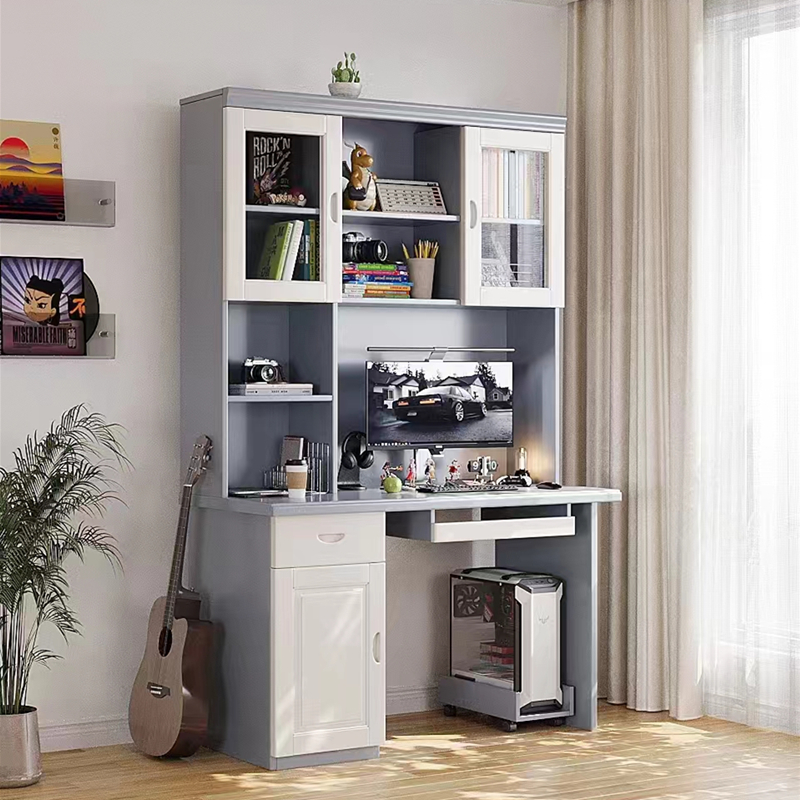 青木川 实木书桌带书架书柜一体落地客厅卧室房间书房中学生台式电脑桌办公桌学习写字桌简约现代中式 灰白色 长宽高:120*60*191厘米