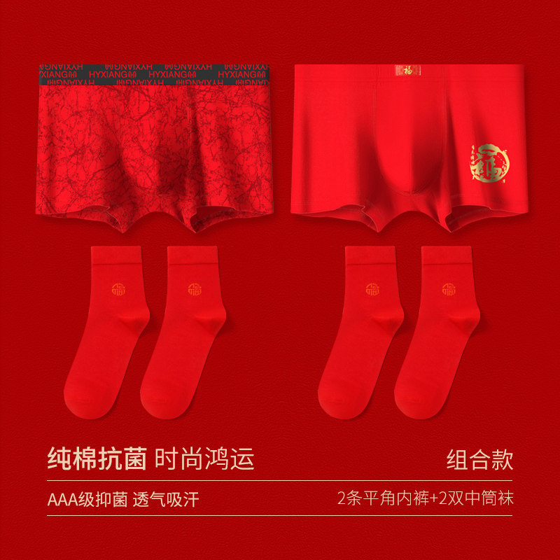 恒源祥本命年内裤男士平角纯棉大红色属虎年结婚四角短裤棉_798 195/5XL C款【2内裤2袜子】蒸蒸日上
