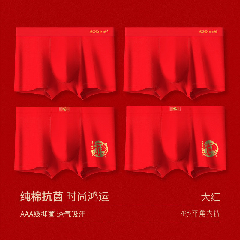 恒源祥本命年内裤男士平角纯棉大红色属虎年结婚四角短裤棉_798 185/3XL B款【4内裤】招财进宝