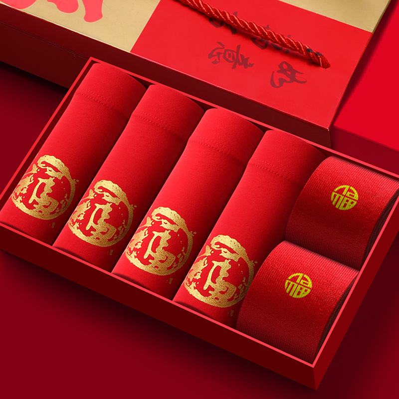 恒源祥本命年属牛年纯棉男士内裤平角裤大红色四角短裤头结婚 185/3XL(推荐体重160-180斤) 【4内裤2双袜子】财运牛气