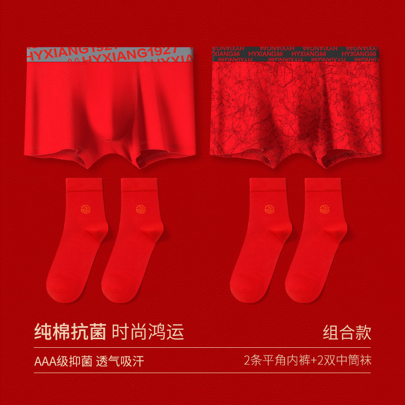 恒源祥本命年内裤男士平角纯棉大红色属虎年结婚四角短裤棉_798 190/4XL C款【2内裤2袜子】大吉大利
