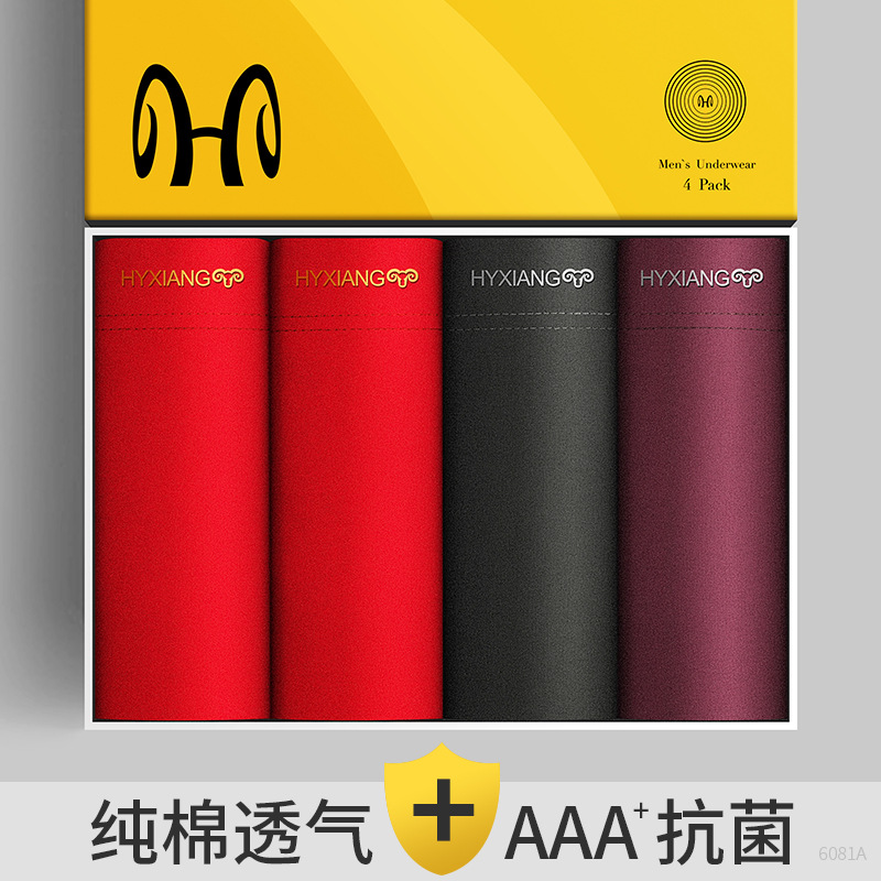 恒源祥男士内裤男本命年大红色牛年中腰平角裤结婚属牛四角短裤头 XXXL(适合体重150-170斤) 红色+酒红+黑色4条礼盒装