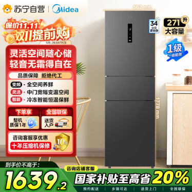 美的(Midea)三门大容量智能家用冰箱小型三开门一级风冷无霜变频低躁34db双净味租房宿舍小冰箱MR-283WTPZE