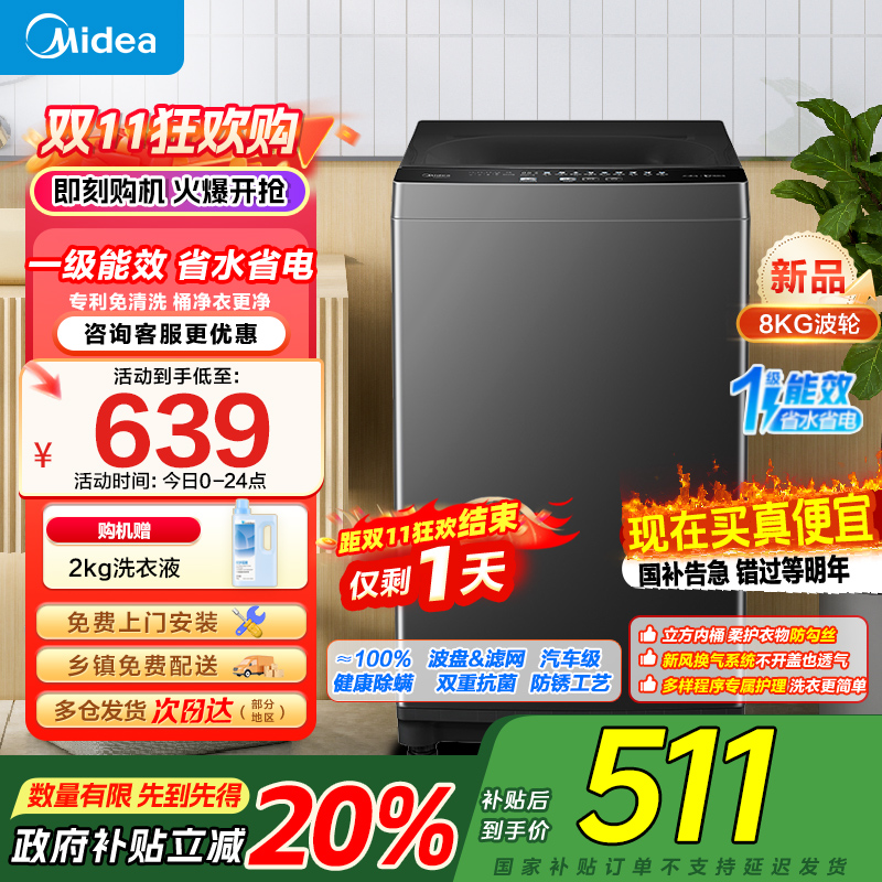 美的(Midea)波轮洗衣机全自动家用 8公斤升级一级能效抗菌除螨专利免清洗家电国家补贴 MB80V37T