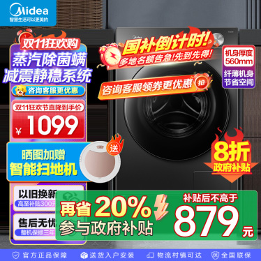 美的(Midea)全自动滚筒洗衣机10公斤家用大容量变频电机一级能效1.1高洗净比蒸汽除菌除螨简尚系列MG100V36T