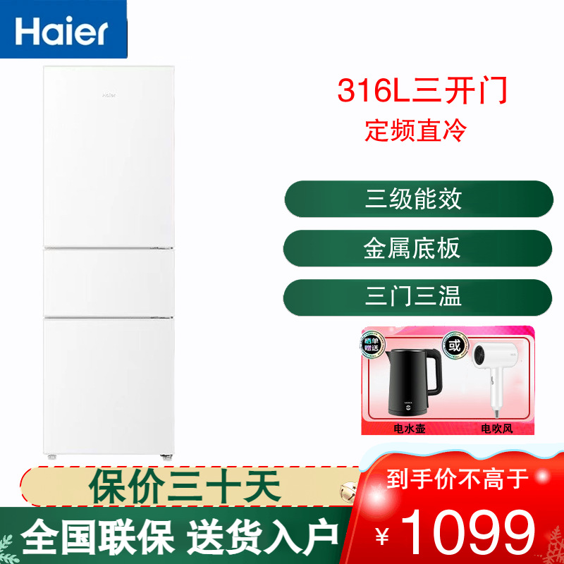 海尔(Haier)经典三开门冰箱216L容量家用小冰箱小型小巧不占地节能省电低音运行 BCD-216LHC3E0WV