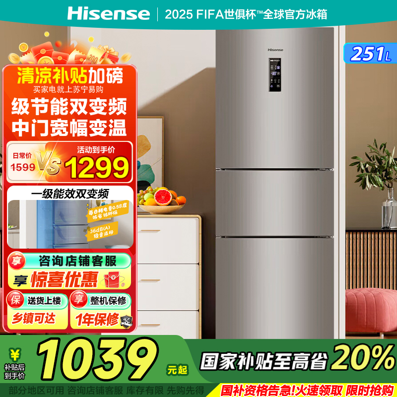 小体积大容积三门无霜冰箱,双变频,高效节能环保