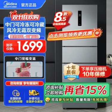美的美的 (Midea) 238升两门双门门节能低音双变频风冷无霜超薄大容量小型家用电冰箱 MR-249WPE