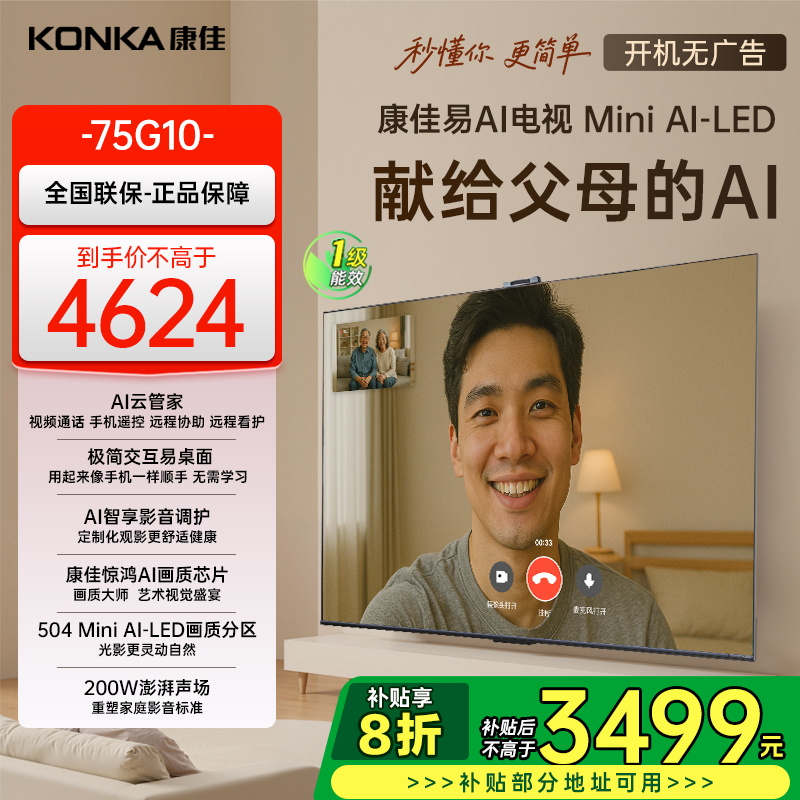 康佳电视75G10 75英寸 易AI电视机 惊鸿AI画质芯片 低反屏 Mini LED 多分区 液晶智能平板