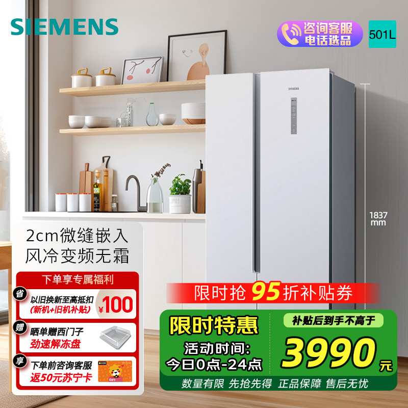 [超薄嵌入]西门子501L对开双开门家用电冰箱官方超薄无霜 白色超薄大容量变频KX50NA20TI