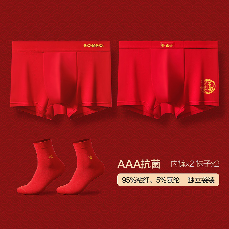 恒源祥本命年内裤男士平角裤纯棉大红色属虎年结婚四角短裤头_22 185/3XL 【2内裤2袜子】红红火火